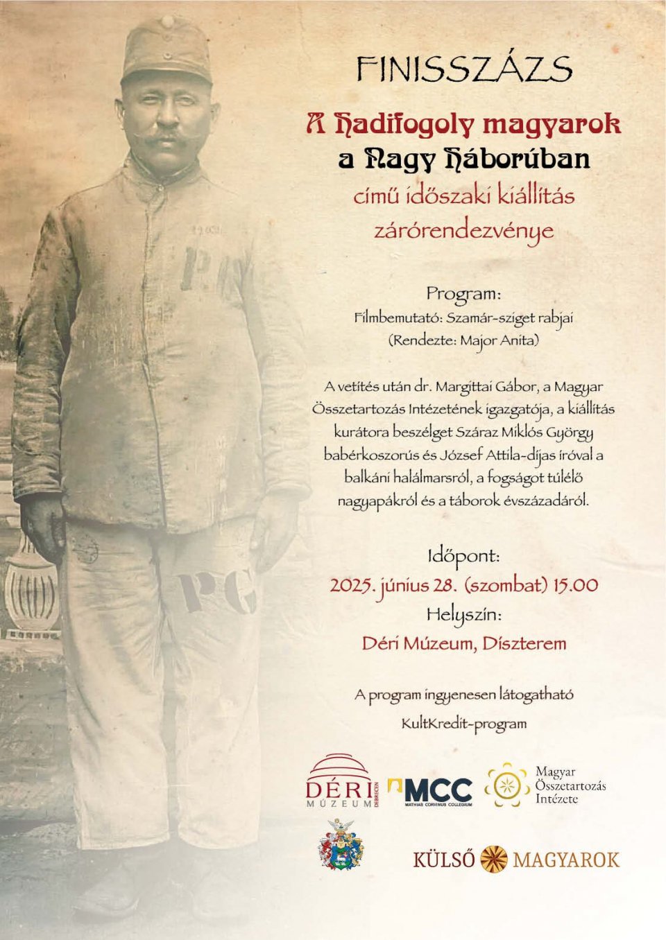Filmbemutatóval és pódiumbeszélgetéssel zárul intézetünk Hadifogoly magyarok a nagy háborúban című kiállítása, amely a debreceni Déri Múzeum közreműködésével valósult meg.
