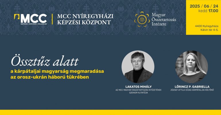 „A kárpátaljai magyarság helyzete a Kárpát-medencei magyar élet legnehezebb és legfájdalmasabb pontja, és itt van a legkisebb esélye, hogy a felhők rövid távon eltűnjenek” – jegyezte meg a MÁÉRT 2023. novemberi ülésén Orbán Viktor miniszterelnök, és a jóslat fájdalmasan beigazolódott. 2025. június 24-én délután az MCC nyíregyházi képzési központjának Kálvin téri székházában népes közönség előtt tartotta meg a kárpátaljai magyarság múltjáról és jelenéről szóló előadását Lakatos Mihály, a Magyar Összetartozás Intézetének szenior kutatója és Lőrincz P. Gabriella József Attila-díjas kárpátaljai költőnő.