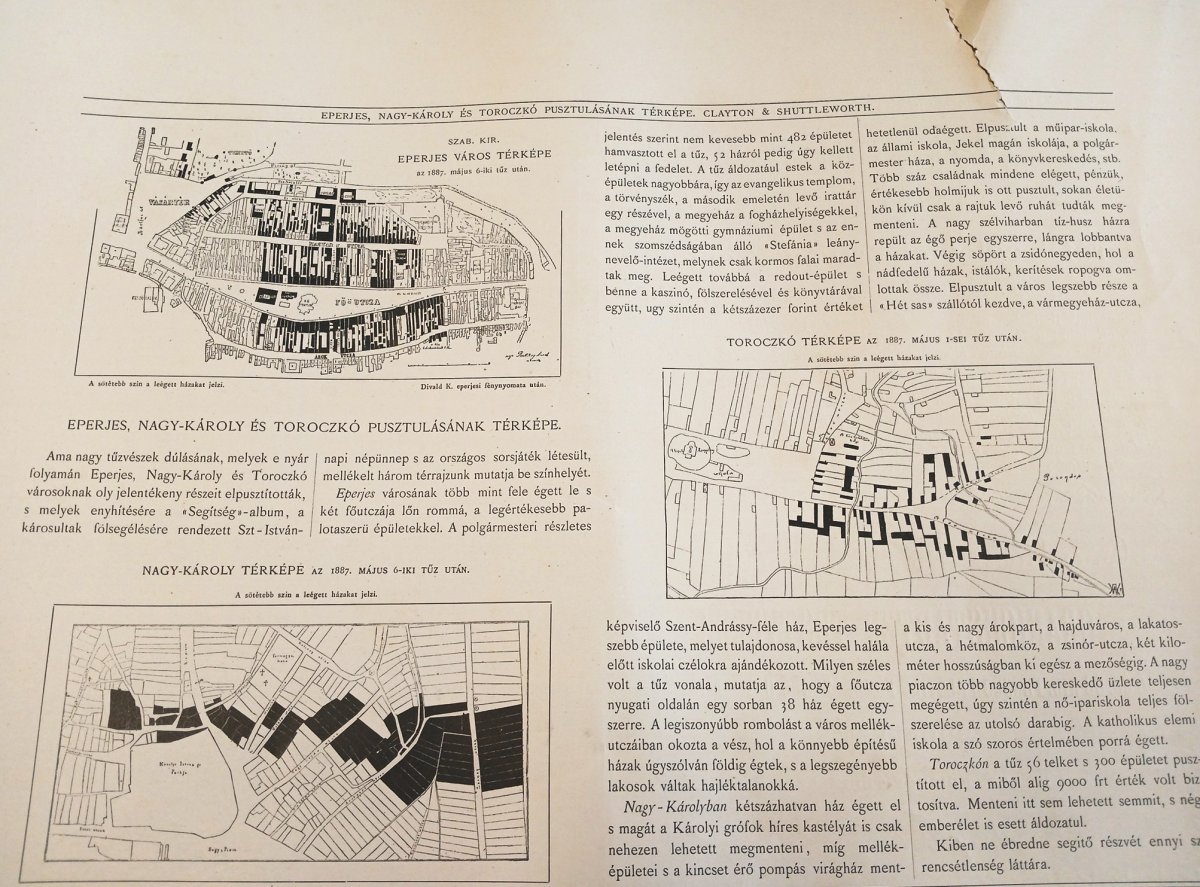 Eperjes égéséről így írt 1887-ben a Vasárnapi Újság május 29-i száma: „Eperjes talán valamennyi közt legkevésbbé hordta magában a tűzveszélyességet. Felvidéki város, a mi azt jelenti, hogy ott bőven van kő, szilárdan lehet építkezni. A város már régen kiépült, az ujabb idők szépítették emeletes utcza-soraiban egymásután keletkeztek a középületek, emelkedtek a díszes magán házak. A szerencsétlenség nagy csapásainak kellett egyesülni, hogy a városnak épen legszilárdabban, legszebben épült része legyen a lángok martaléka. Szélvihar szította a kitört égést, szerteszét hordva a lángoló üszköket nagy távolságokba. Május 6-ikán d. e. 10 óra után gyúlt ki az első ház, az árok-utczában, a gör. kath. templom közelében, s mire a tűzoltók kivonultak, a széltől vitt zsarátok felgyújtották a fő-utcza emeletes házait is.”
