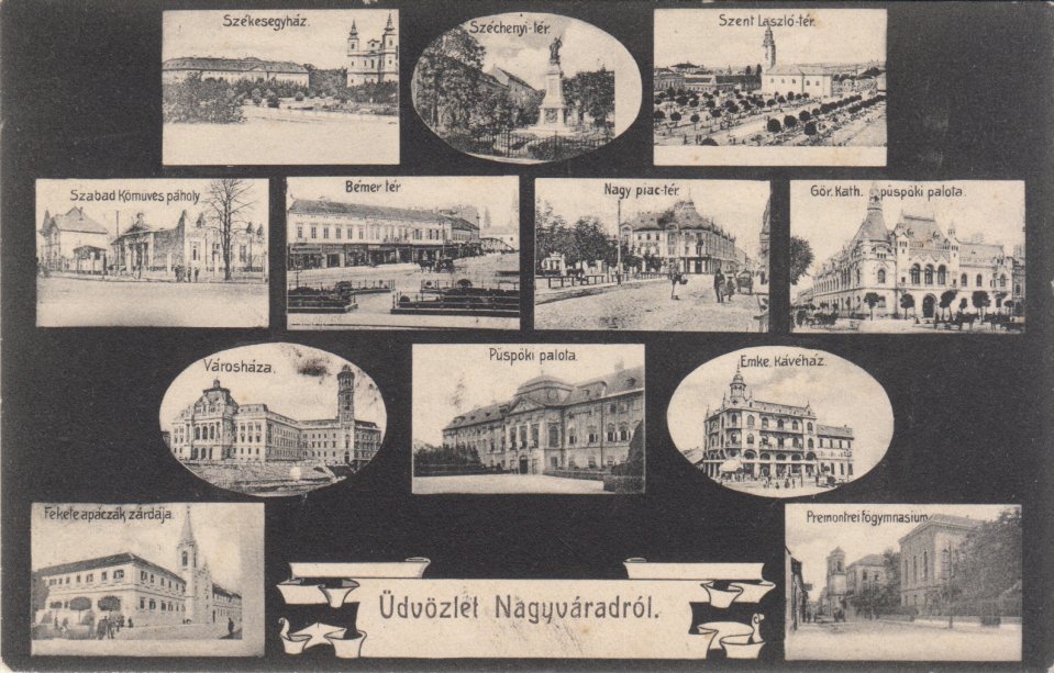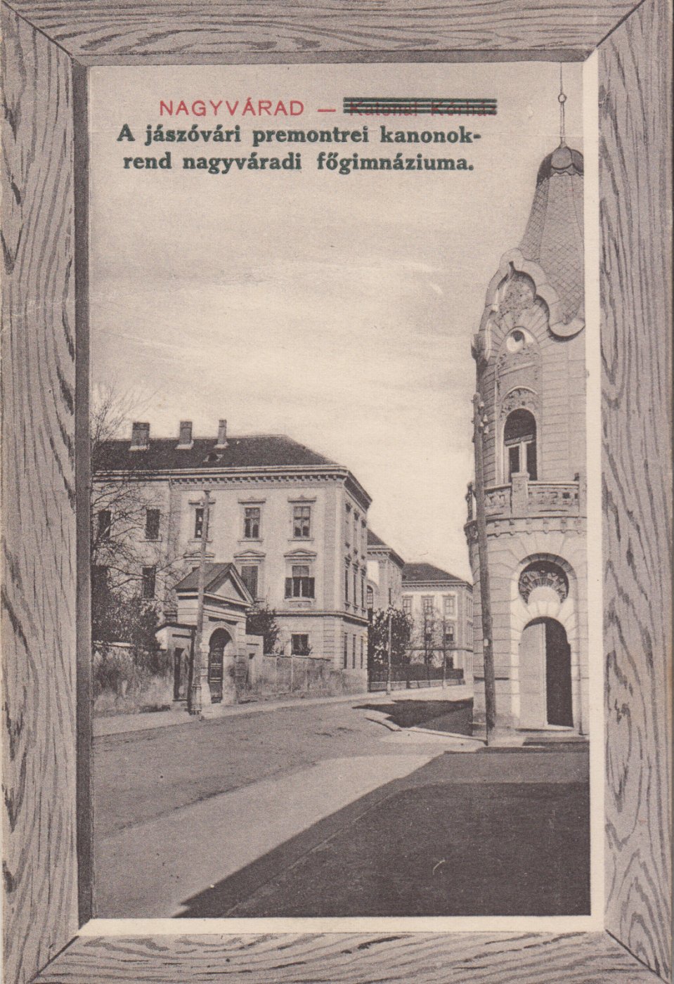 Gyűjteményem nemrég olyan ritka példánnyal is bővült, amely eddig sem aukción, sem közgyűjteményben nem bukkant fel, pedig jómagam már idestova másfél évtized alatt több száz típusú nagyváradi képeslappal találkoztam. A képkeretet imitáló, 1911-ben postázott lap a legritkább felvételnek számít a jászóvári premontrei kanonokrend nagyváradi főgimnáziumáról, és ezen a háttérben, a gimnáziumi szárny mellett a jogakadémia traktusa is látszik. Maga Budapest is megirigyelhetne ilyen léptékű oktatási intézményt.