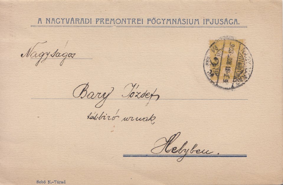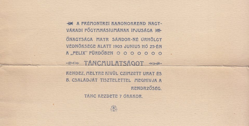 Gyűjteményem egyéb papírrégiségeket is őriz a rend váradi jelenlétéhez, történetéhez szorosan kapcsolódóan. Az egyik egy sárga turulos, szent koronás bélyeggel feladott, nagy méretre kihajtható hivatalos meghívó, amelyet „a premontei kanonokrend nagyváradi főgymnásiumának ifjusága” küldött szét 1903-ban a városhoz közeli Félixfürdőn megtartandó táncmulatságuk apropóján.