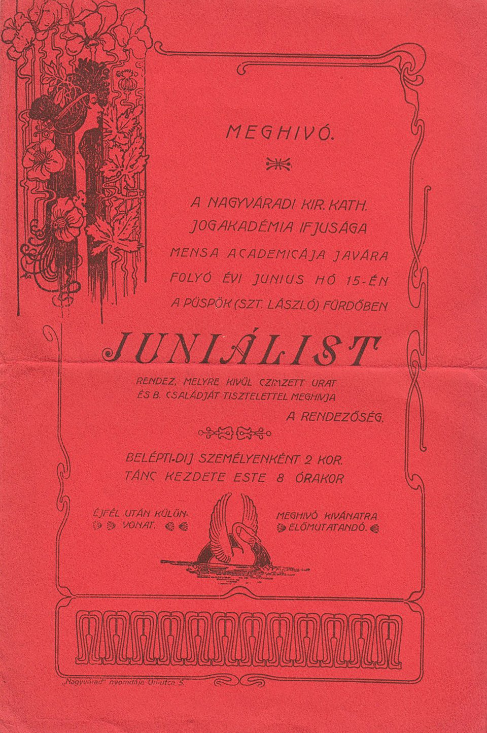 De az egykor Ady Endrét is a hallgatói között tudó jogakadémia ifjúsága is aktív volt a szervezésben. Ezt bizonyítja az az élénkpiros lapra nyomtatott, szecessziós motívumokkal tűzdelt, immár püspökfürdői juniálist hirdető meghívó, amelyet még korábban, 1901-ben adtak fel.